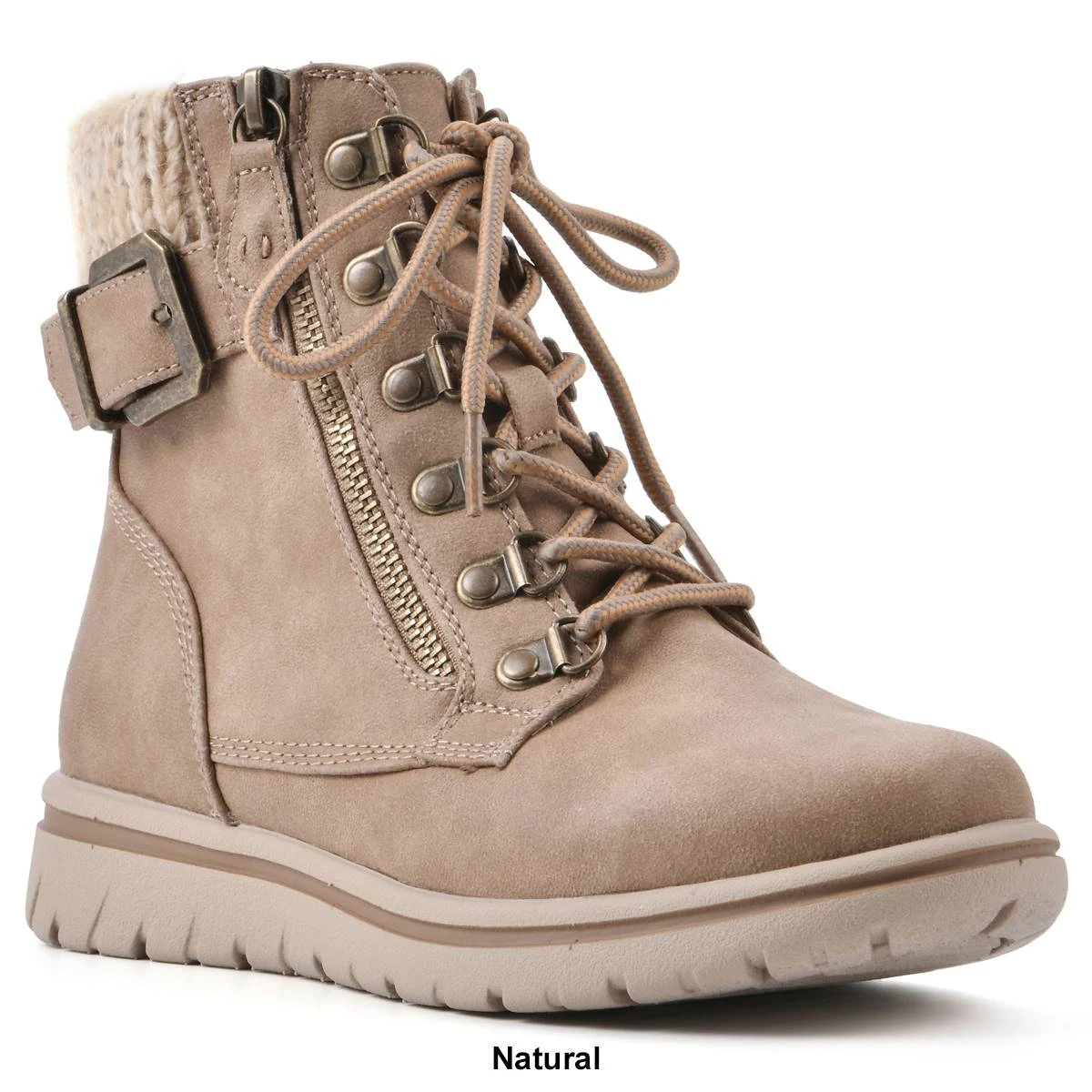 Set the stage with these Womens Cliffs by White Mountain Hearty lace-up ankle boots. Features a decorative zipper, buckle accents, and a knit collar that adds a snuggly style to this cold weather staple.