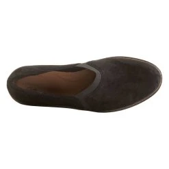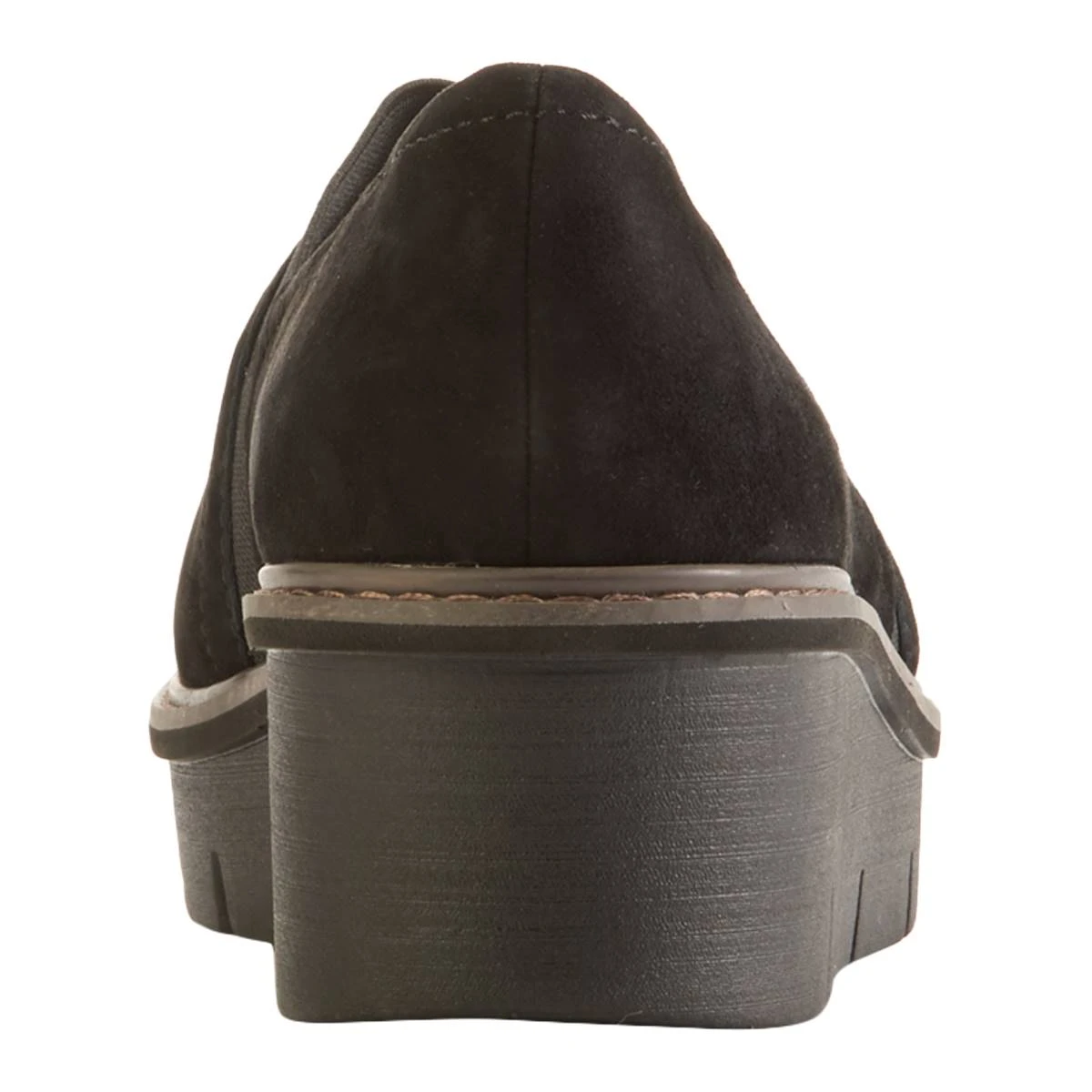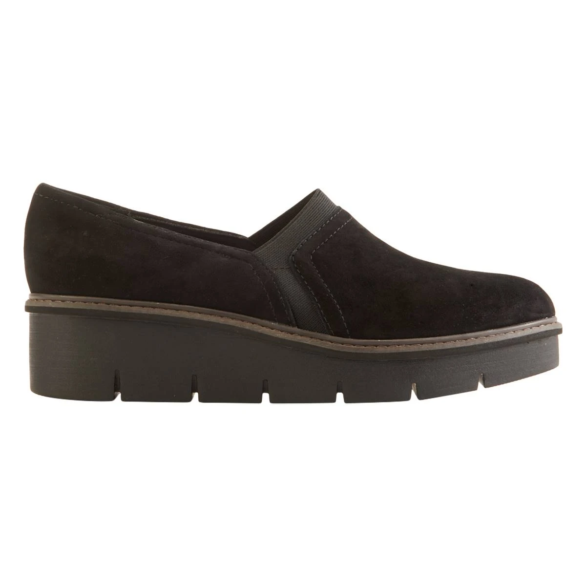 The Womens Clarks® Airabell black suede loafers are as contemporary as it is comfortable. An ultimate comfort foam footbed combines heel and arch support for luxurious all-day cushioning, and the airy sole with flex grooves absorbs the impact of every step. Perfect for life on-the-go, this shoe’s hidden elasticated panels and inside zips ensure easy on and off. Ruffle detail adds feminine flair.Also available in Wide Widths.