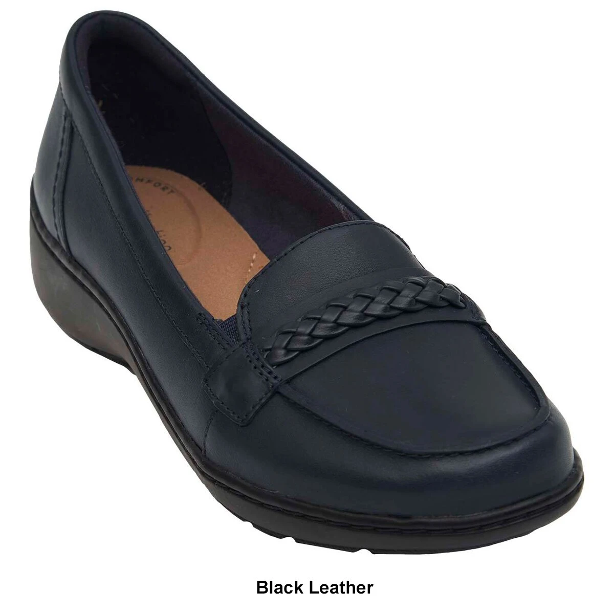 Simple and versatile, these Womens Clarks® Cora Viola loafers take you from work, to the weekend, and anywhere in between. These loafers feature curved sole for slight elevation, cushioned footbed, that absorbs impact, durable outsole, and a braided detail on the vampAlso available in Wide Widths.