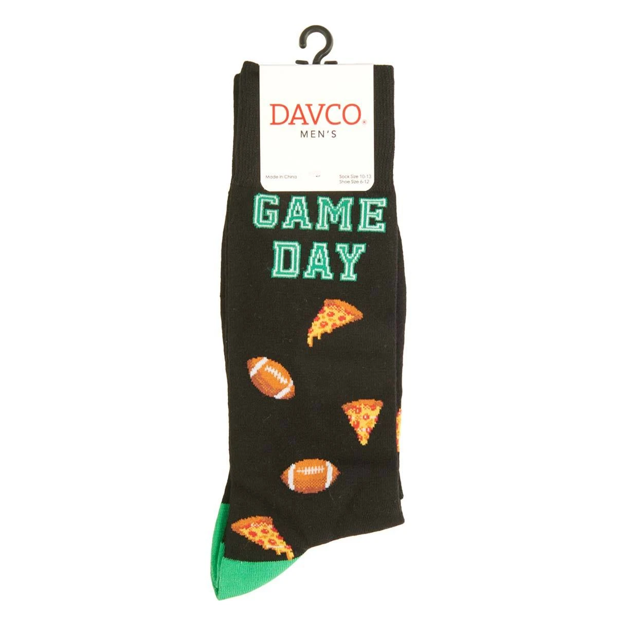 Add some style to your Sunday outfits with the Mens Davco football and pizza socks. These socks feature a crew length and “Game Day” script.