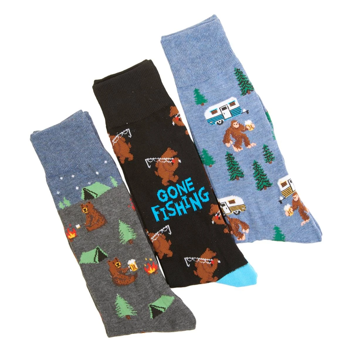 - Socks 2: ribbed cuffs, “Gone Fishing” text, grizzly bear with fishing rod graphic pattern, color block