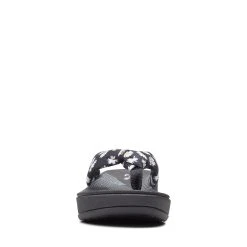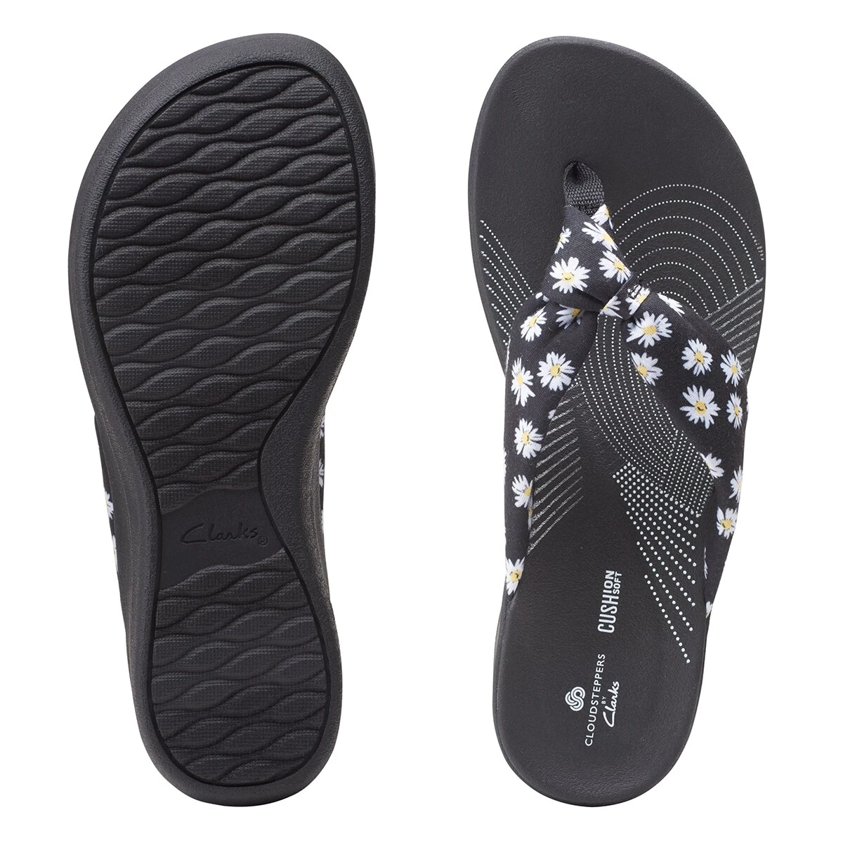 The Womens Clarks® Arla Glison Cloudsteppers™ daisy print flip flop sandals collection provides the best of comfort technology with classic feminine appeal. A heathered fabric upper gives it a playful edge and feels delicately soft between the toes. A Clarks Cushion Soft™ with OrthoLite® footbed ensures optimal comfort while an EVA midsole keeps it feather-light. An ultra-wearable sandal with no shortage of personality.Super-lightweight and versatile, Cloudsteppers™ by Clarks offer unbeatable underfoot comfort thanks to our pioneering Cushion Soft™ technology. You’ll love every move you make when you feel like you’re walking on air.